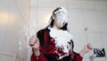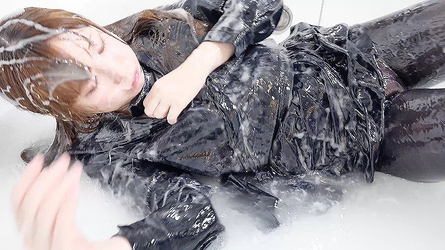 She is wearing her school uniform. She is covered in white liquid while still in her uniform. She is covered in slimy liquid all over her body.