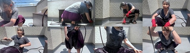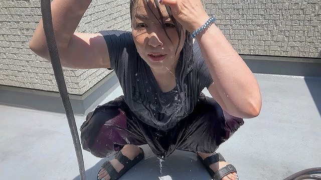 千花の脳内世界「夏のベランダ掃除2025②」毎年恒例のびしょ濡れベランダ掃除、広いベランダの方。夏の普段着で着ているアラジンパンツ、動きやすいし濡らしたら面白そうだったので使用してみました。