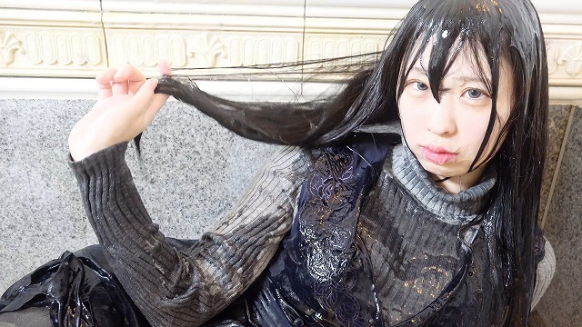 “ぬるぬるにしてください。”紺のワンピースにグレーのニットコーデのしおりさん。ちょっとお姉さん系コーデなのにヌルヌルにしてほしいという。ゆっくりとヌルヌル液体をかけていきます。ニットにはローションが絡みつき、紺のワンピースはローションのかかったところから濃い色に変わっていく。ニットの胸元からヌルヌル液体を流し込めば中の下着までヌルヌルになってしまう。そのころには綺麗な髪もドロドロになりかわいい顔にもヌルヌル液がたっぷりかかってしまっていた。