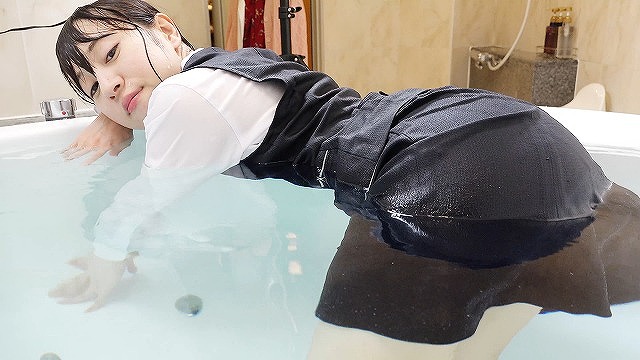 她穿著公司製服。她穿著制服在淋浴時被淋濕了。然後,浸泡在浴缸中並完全濕透。