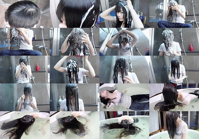 This is an image of woman’s hair. She lathers up a lot and washes her long hair.