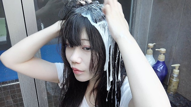 “髪大好き”ゆゆこさんの洗髪シーンをじっくり観察します。そのままの髪にそのままシャンプーを大量にたらします。もじゃもじゃの音を立てながら洗髪します。リンスも大量に使用してつるつるの髪を目指します。すっかり整った髪で出すタブで潜ったり楽しんだりします。