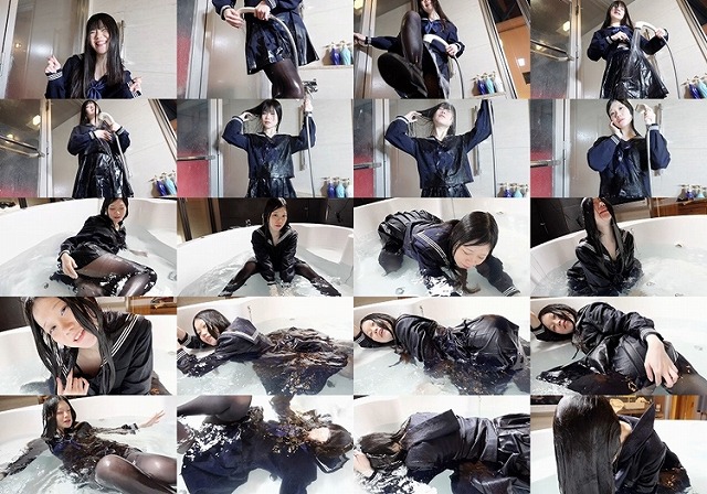 她穿著校服。她穿著制服洗澡,然後泡在浴缸裡。她全身都濕透了。