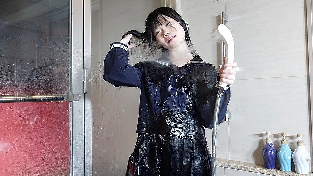 She is wearing her school uniform. She takes a shower and soaks in the bathtub while still in her uniform. She gets completely soaked.