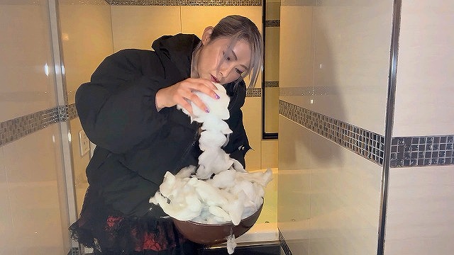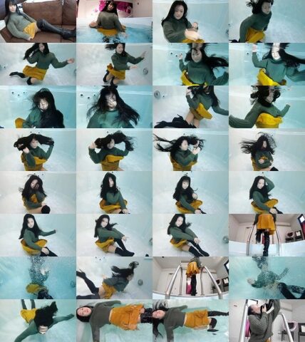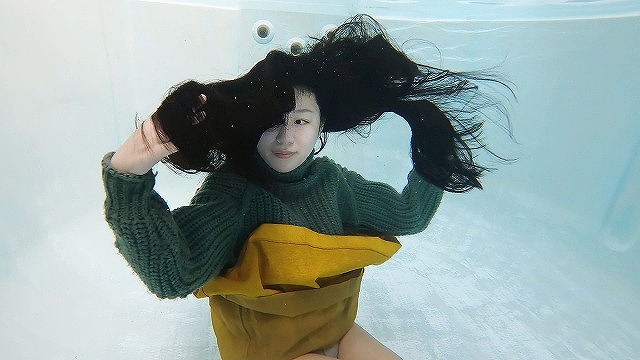 “水中遊戯”冬の服装のままプールに浸かります。セーターはたっぷり水を含んですごく重たくなります。さらにニーハイブーツのままプールに入るものだから、ブーツの中はぐしょぐしょです。でも重たいセーターも水中では軽く感じられるんです、そして私の黒くてロングな髪も身体にまとわりつきながらヒラヒラと漂います。この光景をゆっくり見ているのが好き、この時間が一番好きなんです。あなたにもこの美しい時間を見て欲しい。