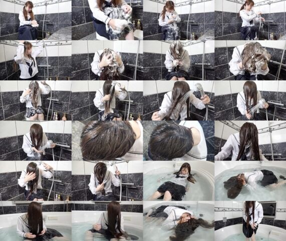 She washes her body in her school uniform. And she washes her hair. She soaks in the bathtub in her school uniform.