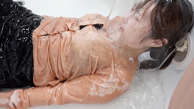 She is covered in slimy liquid with her clothes on. She is covered in slimy liquid all over her body.